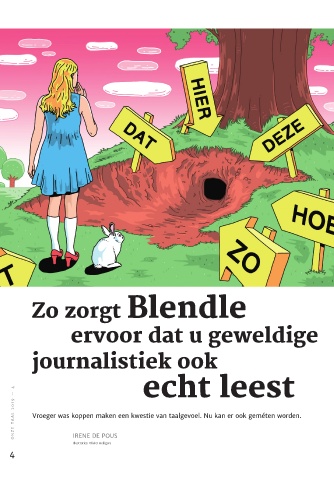 Zo zorgt Blendle ervoor dat u geweldige journalistiek ook echt leest ONZE TAAL 2019 — 4 Vroeger was koppen maken een kwestie van taalgevoel. Nu kan er ook geméten worden. IRENE DE POUS Illustraties: Olivier Heiligers 4