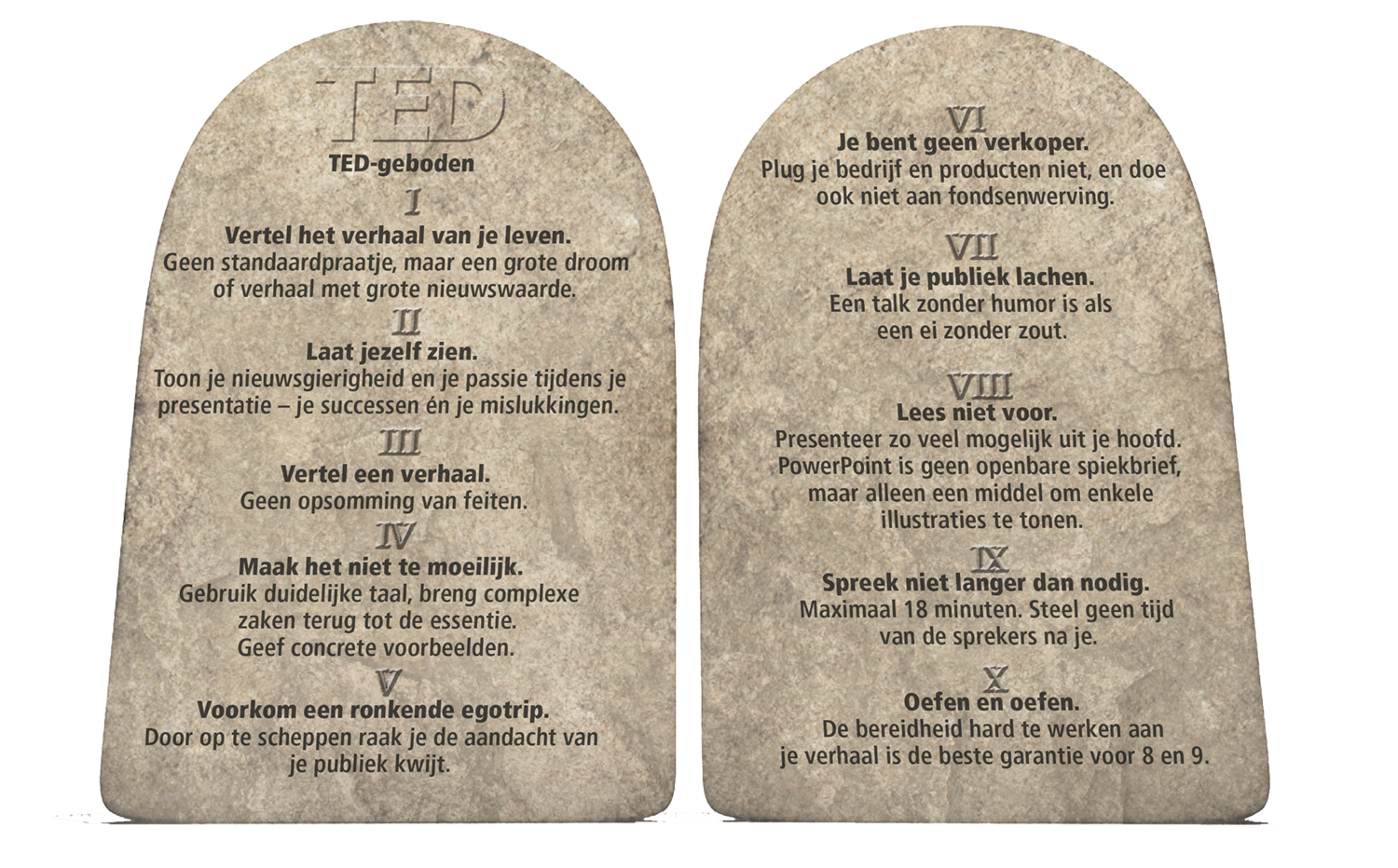Hieronder de Nederlandse versie van de TED Commandments (de tien TED-geboden).